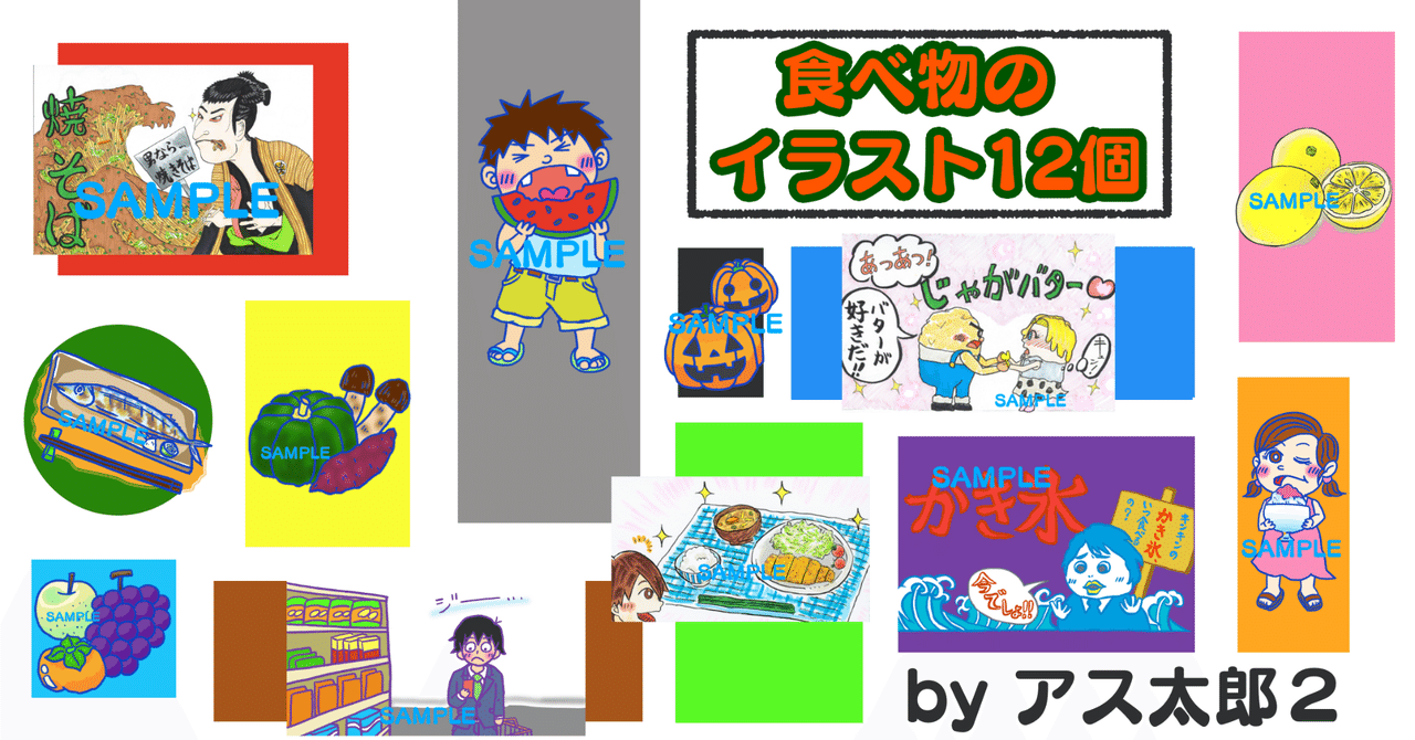 イラストデータ販売 透過png 食べ物のイラスト12個 かき氷 サンマ レモン 梨 ぶどう 柿 焼きそば スイカ カボチャ 松茸 サツマイモ じゃが バター 買い物 とんかつ 夕飯 アス太郎2 Note